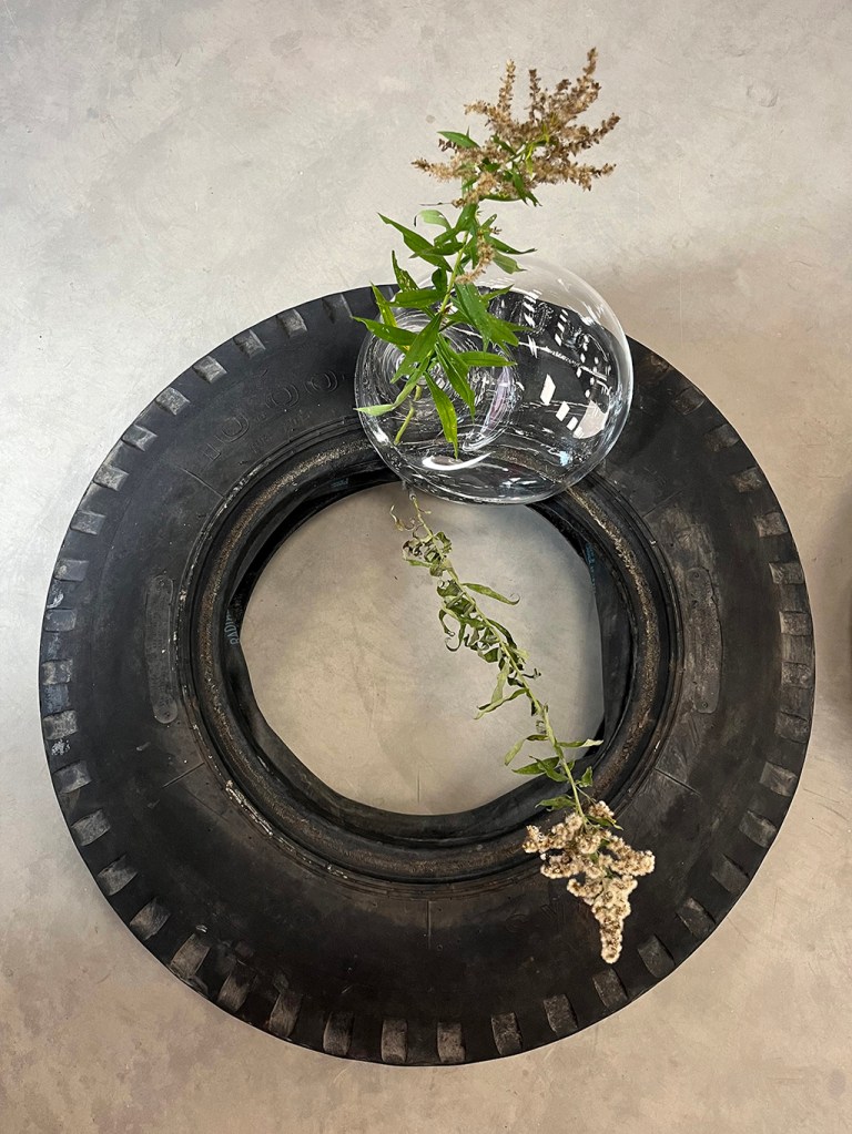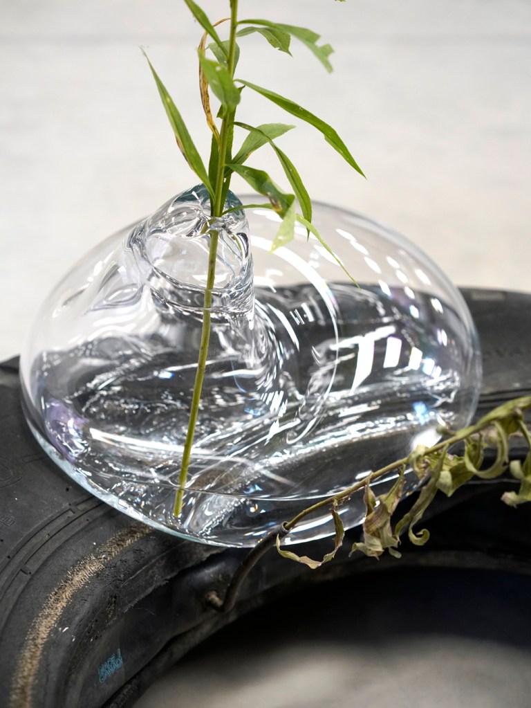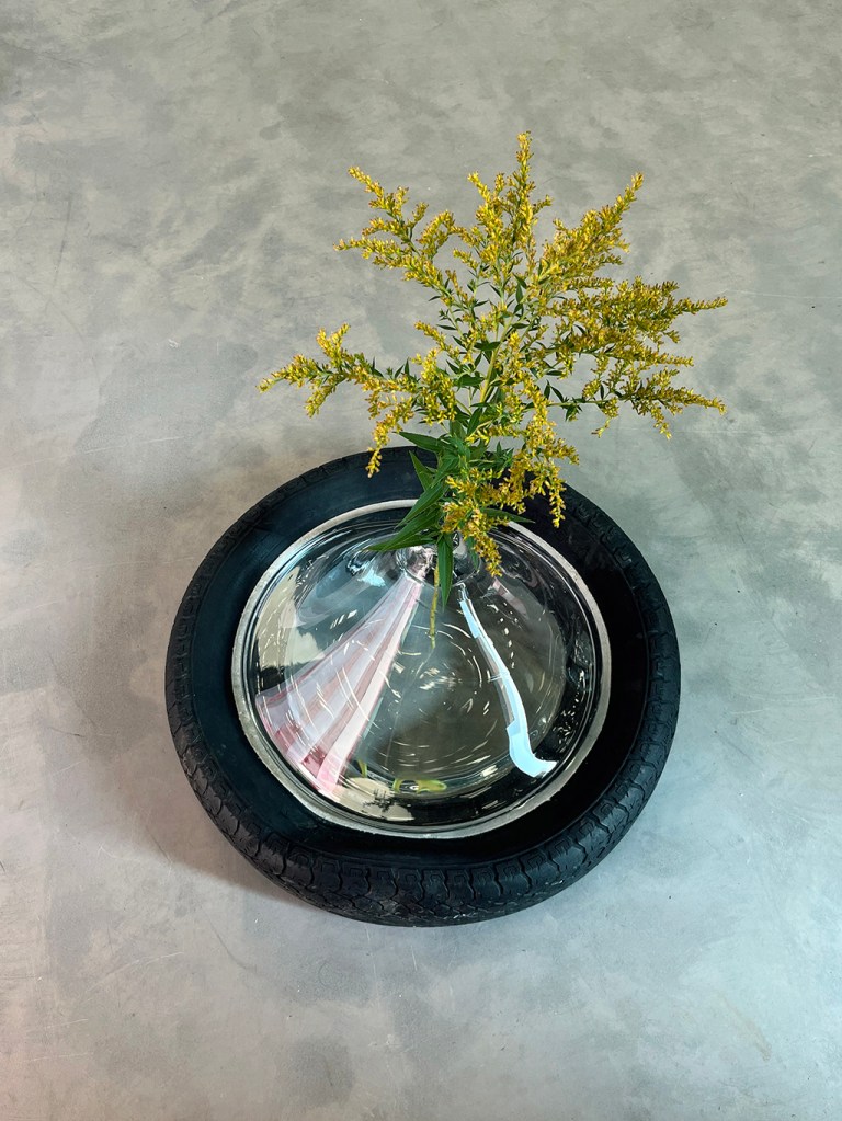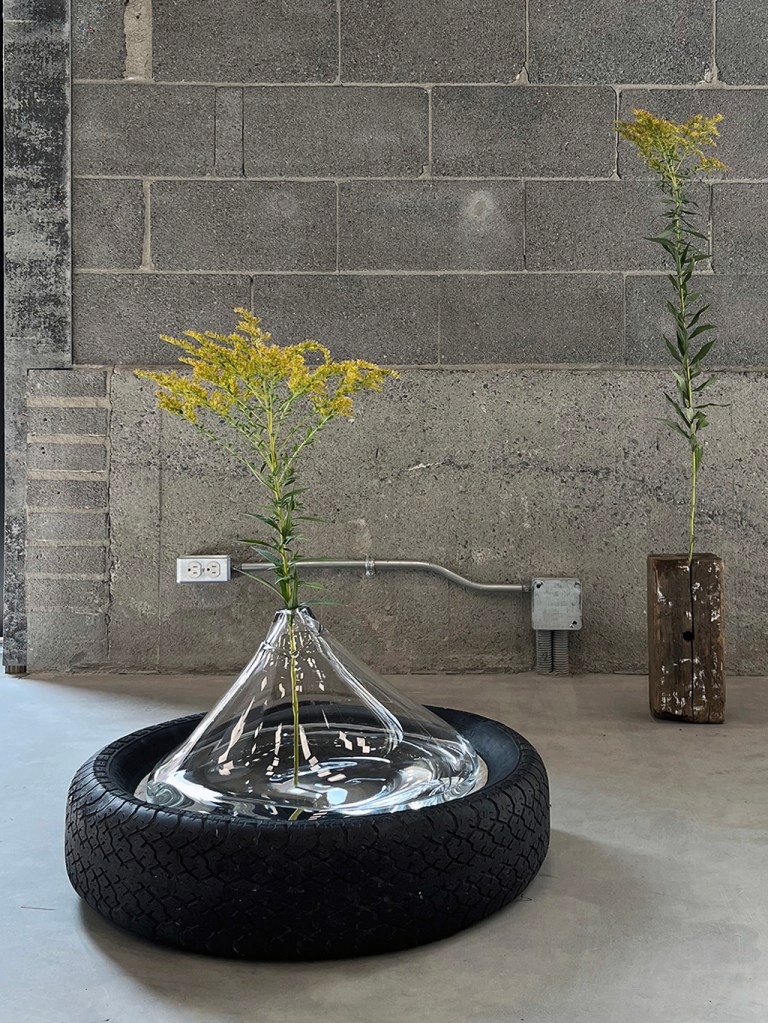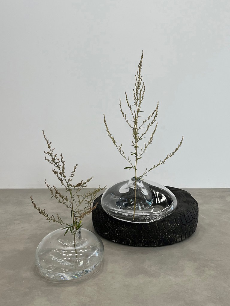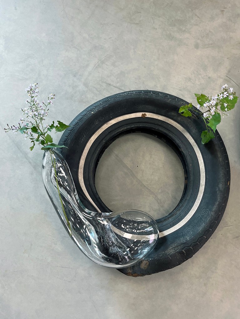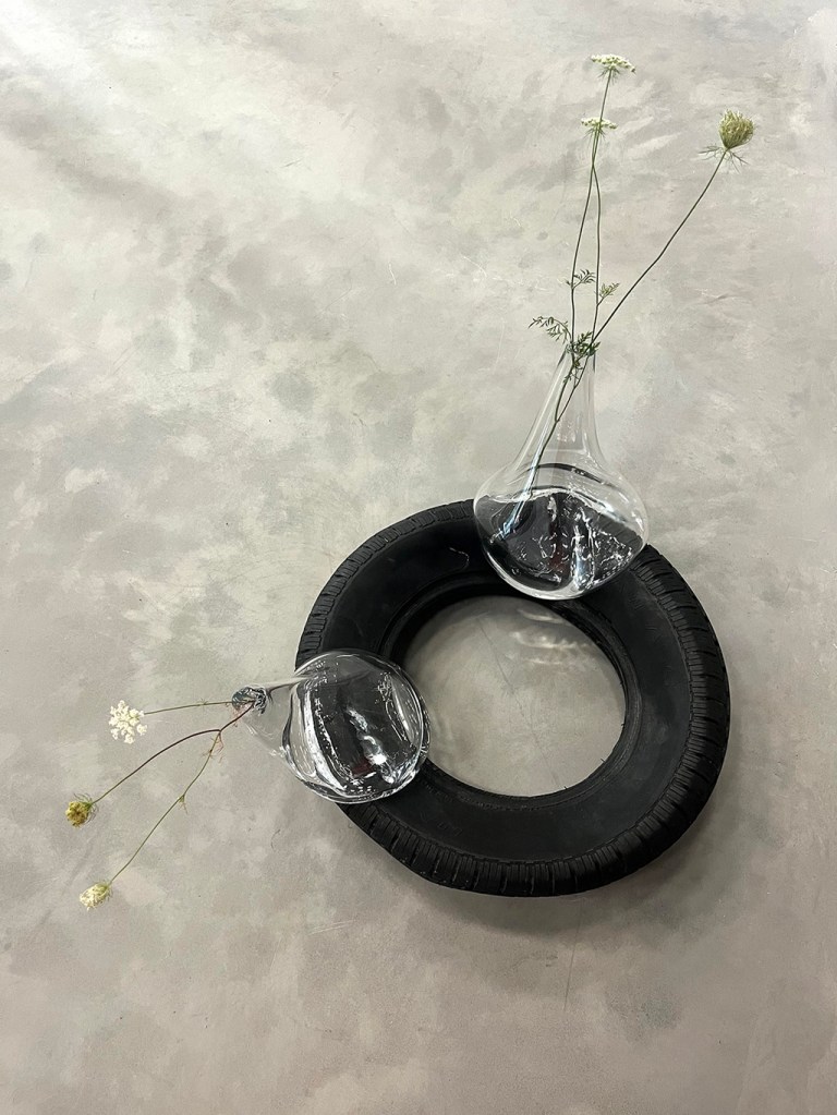 Les œuvres de Julie Roch-Cuerrier explorent les liens entre l’idée du mur mitoyen et celle de la corespiration. L’artiste a récupéré des pneus de l’ancien garage qui occupait autrefois le bâtiment d’Espace Transmission, les utilisant comme moules et empreintes pour réaliser ses sculptures en verre soufflé. Évoquant leur relief extérieur ou l’espace occupé par l’air dans leur cavité interne, les formes de verre semblent se fondre à même la surface des pneus. Dans cette matérialité fluide réside une tentative de représenter deux respirations individuelles qui se rejoignent pour se mouler l’une à l’autre. Bien que les formes soufflées agissent comme des objets individuels, elles existent dans une réalité partagée avec le pneu qui les supporte et leur donne corps: l’œuvre prend son sens à travers leur assemblage. Dans un même esprit que le mur mitoyen en architecture, le tout prend forme par la rencontre d’unités indépendantes : l’individualité s’ancre dans une collectivité.