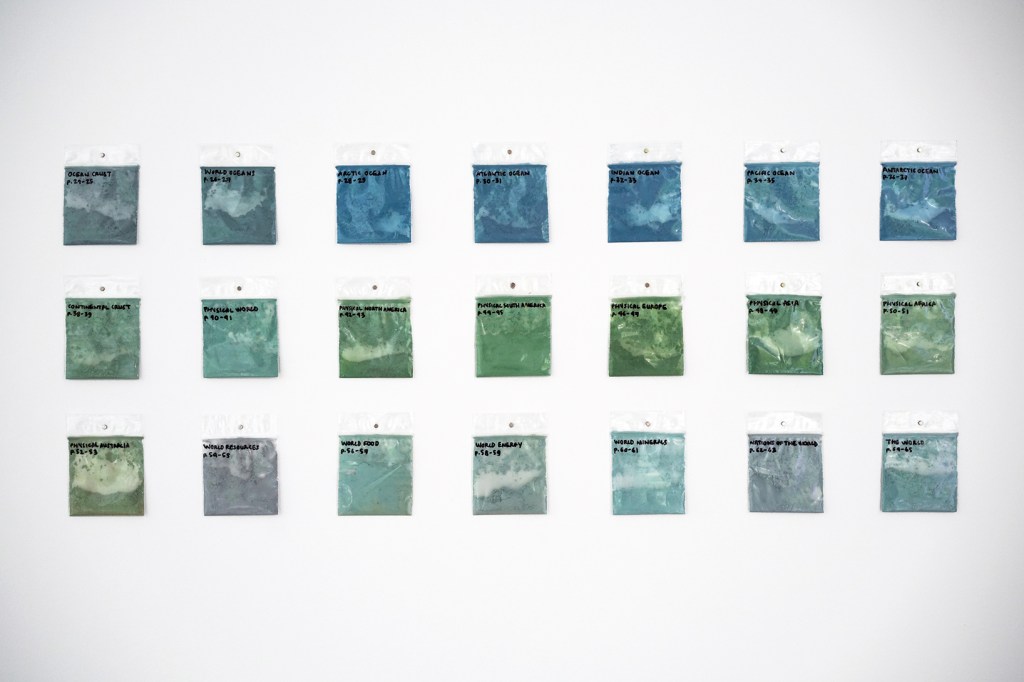 Through the abstraction of the original content of the Atlas in a series of pigment sachets, the artist hopes to open up the interpretation of these colours to a new potential and propose a reconfiguration of the World previously illustrated in the Atlas. Colours for a World calls into question the abstraction of the geographical discipline: the incoherence of cartography in relation to the territory.