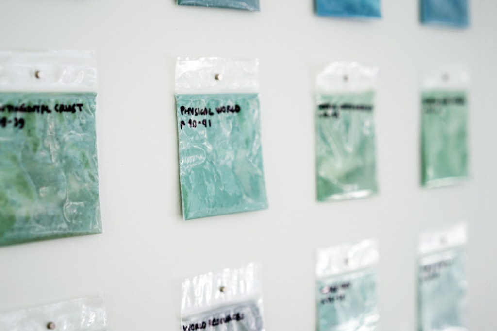 The series of sachets are chromatically arranged from chalky aquamarine to powdery emeralds, classified according to their former representation in the Atlas. It is an attempt to distill these concepts and return them to their very essence. Concepts such as the Universe or the World are reduced to a colour and suddenly become tangible objects. Colours for a World is an attempt to materialize the unfathomable.