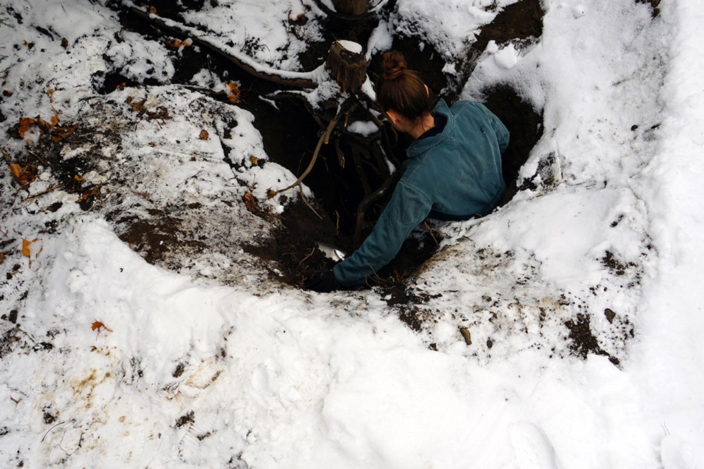 In the fall of 2016, the artist gradually unearthed the stump over a period of several months. A performative aspect is attached to this action: in the physicality of the task and the repetition of the gesture. An intimate contact is created with the object while unearthing it: the fragility of the object and the small cavity containing the roots required a slowing down of her process. There is an importance of pace and the passage of time in the artist’s practice: it is part of her questioning. There is a meditative quality associated with the repetitiveness of the act of digging. It was a moment of introspection during which the artist began to question her perception of duration: her lived and felt experience of time.